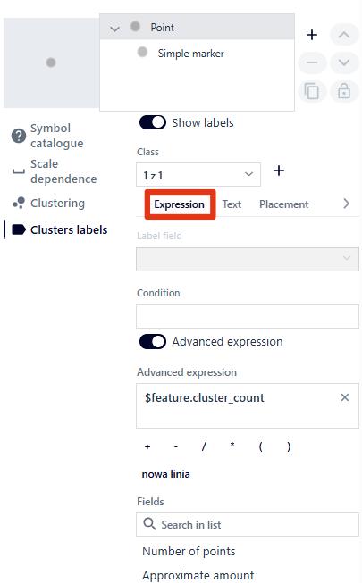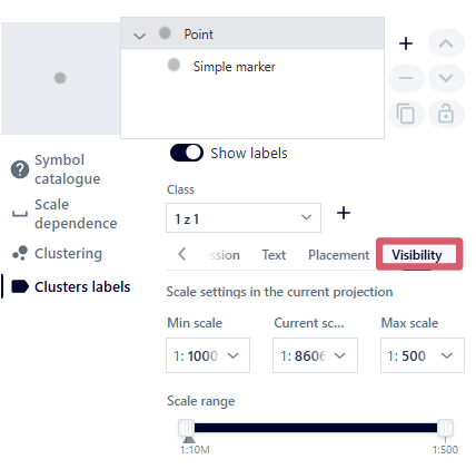 ). Tools for symbolizing the layer are displayed. Additionally, the user can set the layer’s scale range here using the slider or by entering or selecting a scale value from the list. Scale settings apply to the EPSG 2180 system.