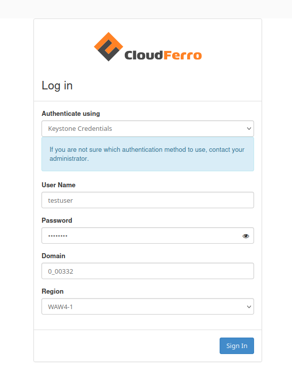 Wyloguj się z konta administratora i zaloguj się jako użytkownik, tym razem wybierając z listy rozwijanej pozycję: „Keystone Credentials”..